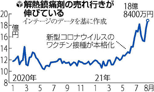調査会社インテージによると、解熱鎮痛剤は高齢者のワクチン接種が本格化し始めた5月以降に増加傾向が顕著となり、8月2~8日と9~15日の各週の販売額はそれぞれ18億円超に上った。