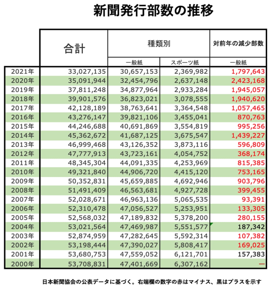 2021年末に公表された日本新聞協会の最新データで、一般紙の総発行部数が