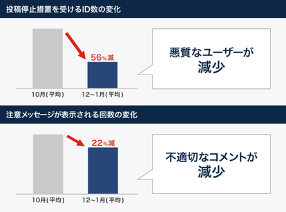 実際の効果は、筆者が考える以上だった。Yahoo! JAPANのリリースによると、施策後には新たに投稿停止措置を受けるような悪質なID数が56%も減少したようだ。また、不適切なコメントを投稿しようとして投稿者に警告が表示される回