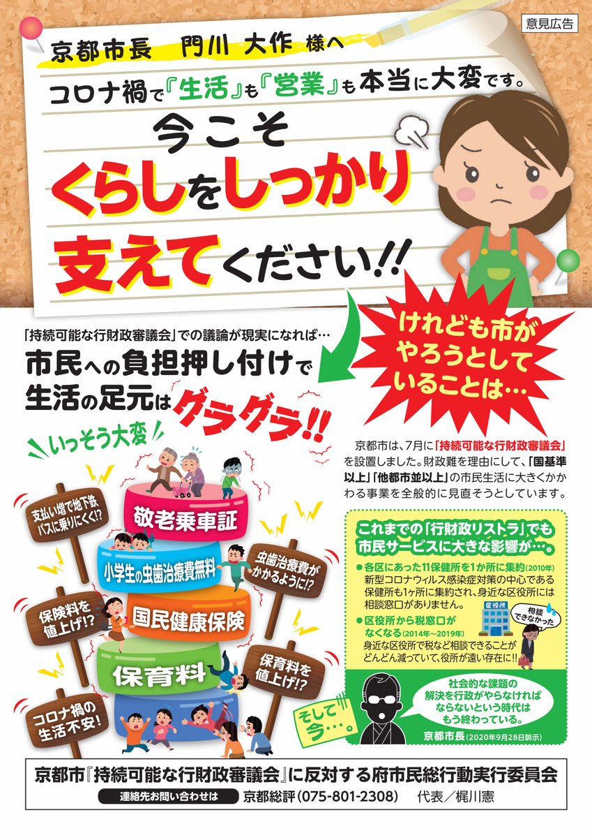 記者会見で、門川氏は「コロナ禍での改革になるのは大変心苦しい」と市民に陳謝。ただ「無駄なことをしてきたとは一切思っていない。ただ、コロナ禍によって継続できなくなったということだ」と強弁した。職員給与については「苦渋の決断だが、カットを提案する」と明言した。
