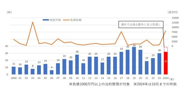 学習塾の倒産がコロナ禍を経て過去最多水準で推移している。2024年1~10月の倒産件数(負債1000万円以上、法的整理)は32件で、前年同期(25件)比で28.0%増加。このままのペースで推移すると、通年の倒産件数は過去最多の2019年(39件)とほぼ同水準になる見通しだ。