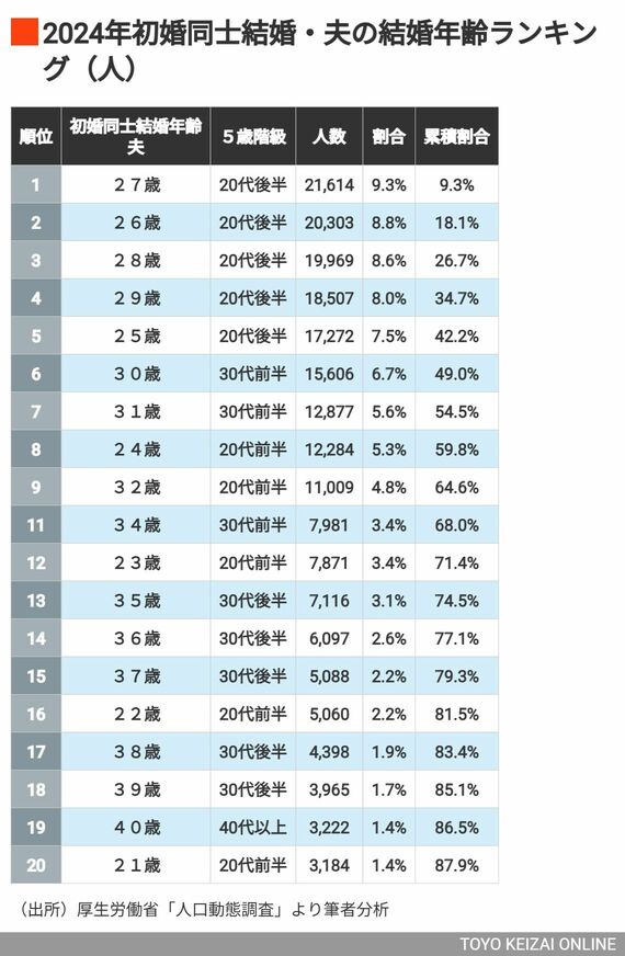 2024年のランキングでみると、20代後半男性がまさに「婚活無双状態」にあり、25歳から29歳の男性の結婚が総婚姻数の4割以上、29歳までの男性の結婚が56%を占める状況です。