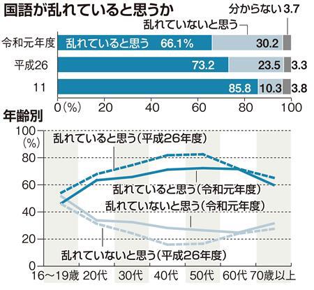 調査は今年2~3月、16歳以上の男女1994人が答えた。「ふだんの生活の中で接している言葉から考えて、今の国語は乱れていると思いますか。それとも、乱れていないと思いますか」との質問に、「非常に乱れていると思う」と「ある程度乱れていると思う」を選んだ人は計66・1%。どのような点で乱れているのかを複数回答で聞くと、「敬語の使い方」と「若者言葉」がそれぞれ6割を超え、「新語・流行語の多用」「挨拶(あいさつ)言葉」がそれぞれ3割を超えている。
