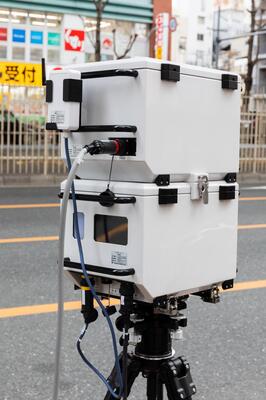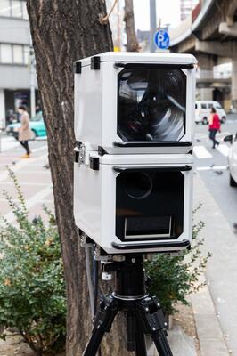 当情報局が新型移動オービス、LSM-310に初めてでくわしたのは、大阪市を南北に貫く新御堂筋線は堂山交差点でのこと。交差点の手前、約30m手前でレーザー探知機が鳴り始め、路肩部分に目をやると、正真正銘の新型レーザー式移動オービスが!
