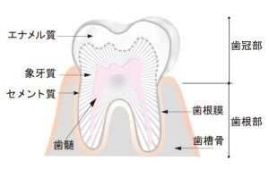 中心部の「歯髄」という神経、それを囲む「象牙質」、その象牙質をさらに覆う「エナメル質」の3つです。