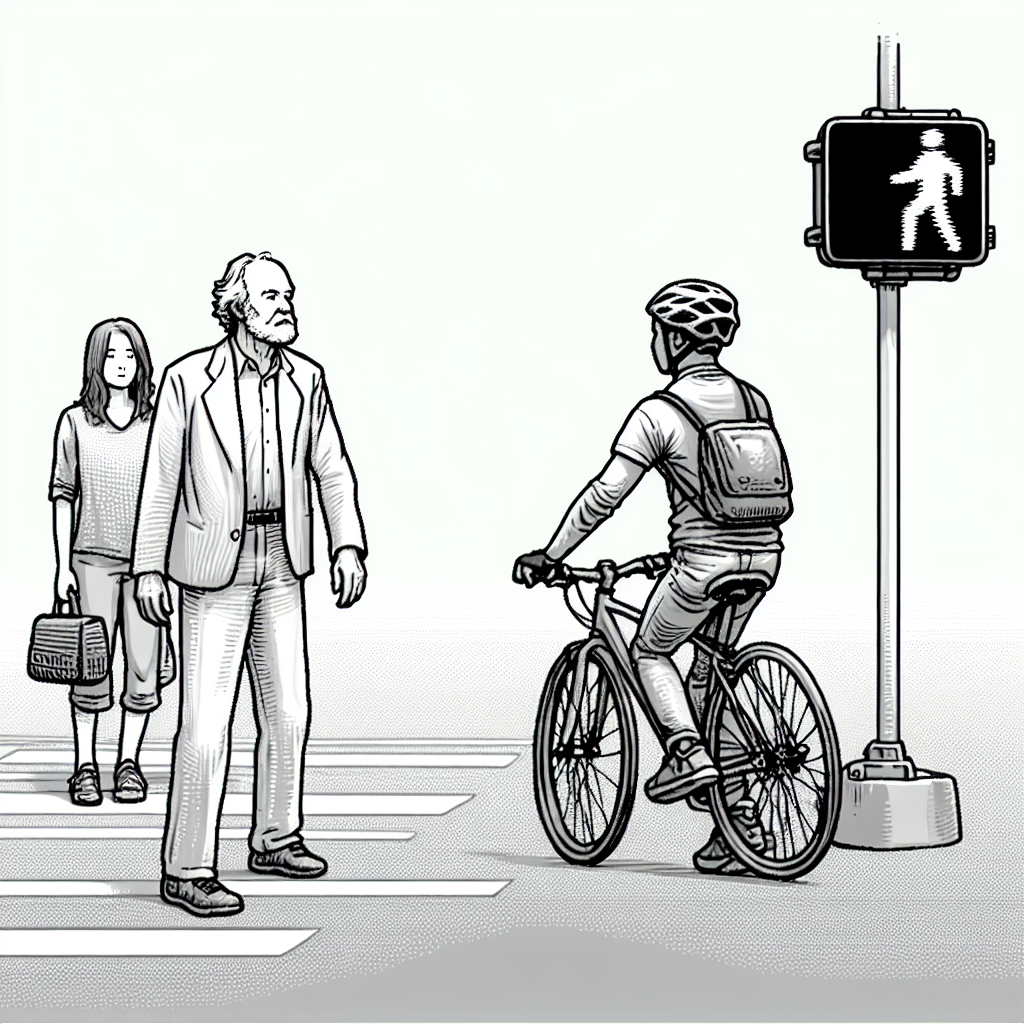 信号機がない道路の横断歩道の端で、自転車にまたがって乗っている人が停まって待っている姿、よく見かけませんか。